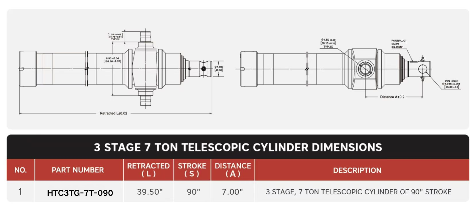 "HTC3TG-7T-090", 3 အဆင့်၊ 7 Ton Of 90" Stroke Telescopic Cylinders