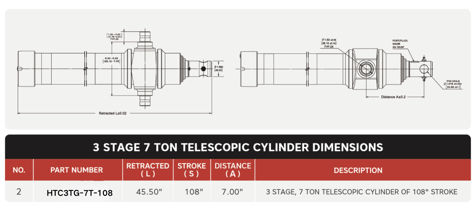 "HTC3TG-7T-108", 3 အဆင့်၊ 7 Ton Of 108" Stroke Telescopic Cylinders