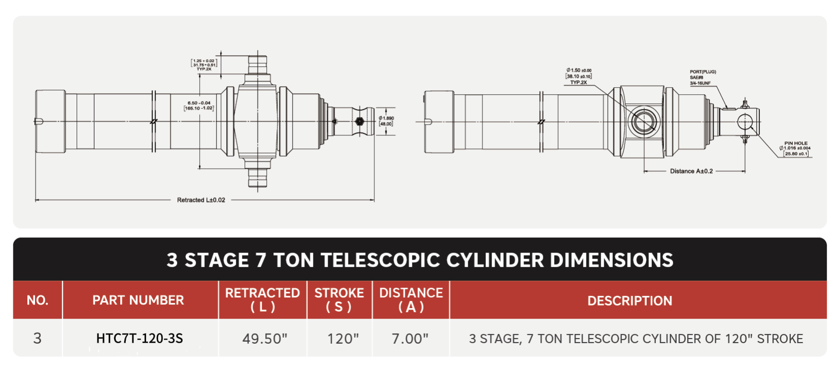 "HTC3TG-7T-120", 3 အဆင့်၊ 7 Ton Of 120" Stroke Telescopic Cylinders