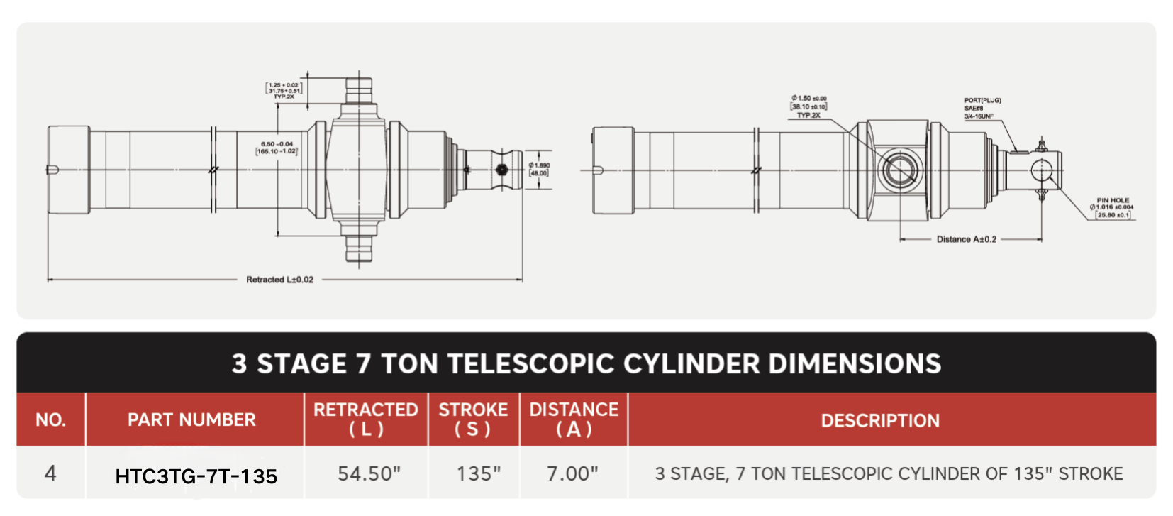 "HTC3TG-7T-135", 3 အဆင့်၊ 7 Ton Of 135" Stroke Telescopic Cylinders