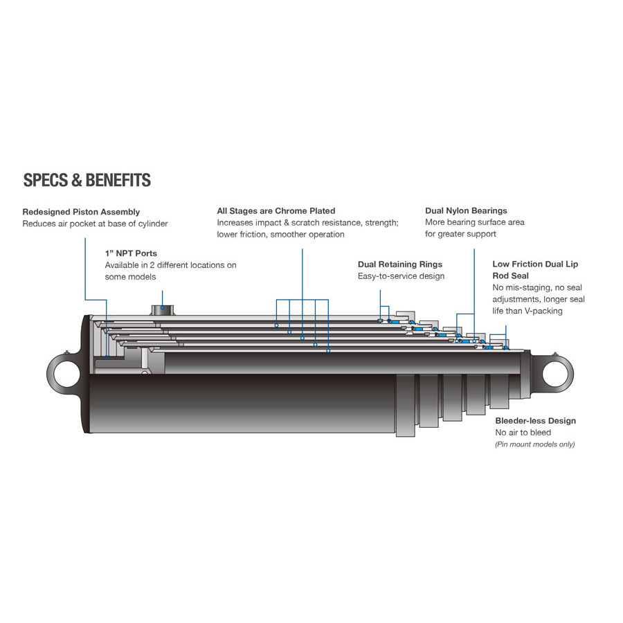 စစ်မှန်သော HCIC pin mount telescopic ဆလင်ဒါများကို အကြမ်းခံ၍ ယုံကြည်စိတ်ချရသော လည်ပတ်မှုအတွက် အင်ဂျင်နီယာချုပ်လုပ်ထားပါသည်။ အခြားပြိုင်ဘက်များ၏ ဆလင်ဒါများထက် ဒီဇိုင်းပိုင်း ပိုမိုကောင်းမွန်လာခြင်း၊ ပွတ်တိုက်မှု နည်းပါးသော နှုတ်ခမ်းနှစ်ချောင်း တံ ဆိပ်နှင့် ချောမွတ်သော လုပ်ဆောင်ချက်အတွက် အဆင့်အားလုံး chrome plated နှင့် roller ပါ၀င်ခြင်း၊ ခြစ်ရာနှင့် ရိုက်ခတ်မှု တိုးမြင့်လာခြင်း၊ သံချေးတက်ခြင်း/ သံချေးတက်ခြင်းနှင့် တုန်လှုပ်ခြင်းတို့ကို ခံနိုင်ရည်ရှိပြီး တည်ငြိမ်မှု ပိုမိုရရှိစေပါသည်။ . ကျွန်ုပ်တို့၏ အထူးပွတ်တိုက်မှုနည်းပါးသော နှုတ်ခမ်းနှစ်ချောင်း တံဆိပ်သည် ပိုမိုချောမွေ့ပြီး မြန်ဆန်သောလည်ပတ်မှုအတွက် ပွတ်တိုက်မှုကို လျော့ချပေးခြင်း၊ လက်လွတ်စဥ်းစားခြင်းမရှိဘဲ၊ တံဆိပ်ချိန်ညှိမှုများမလိုအပ်ဘဲ၊ စံ V-packing ကဲ့သို့ ဖိသိပ်မှုမသတ်မှတ်ထားဘဲ၊ V-packing ထက် တံဆိပ်သက်တမ်းပိုရှည်ခြင်းနှင့် ပိုမိုကောင်းမွန်သောလည်ပတ်အပူချိန်အကွာအဝေး။